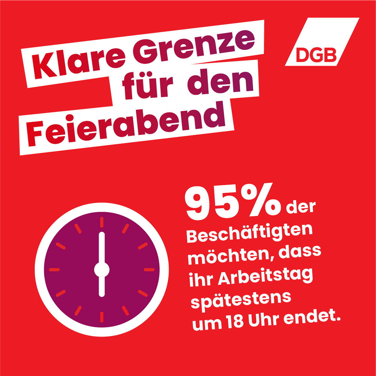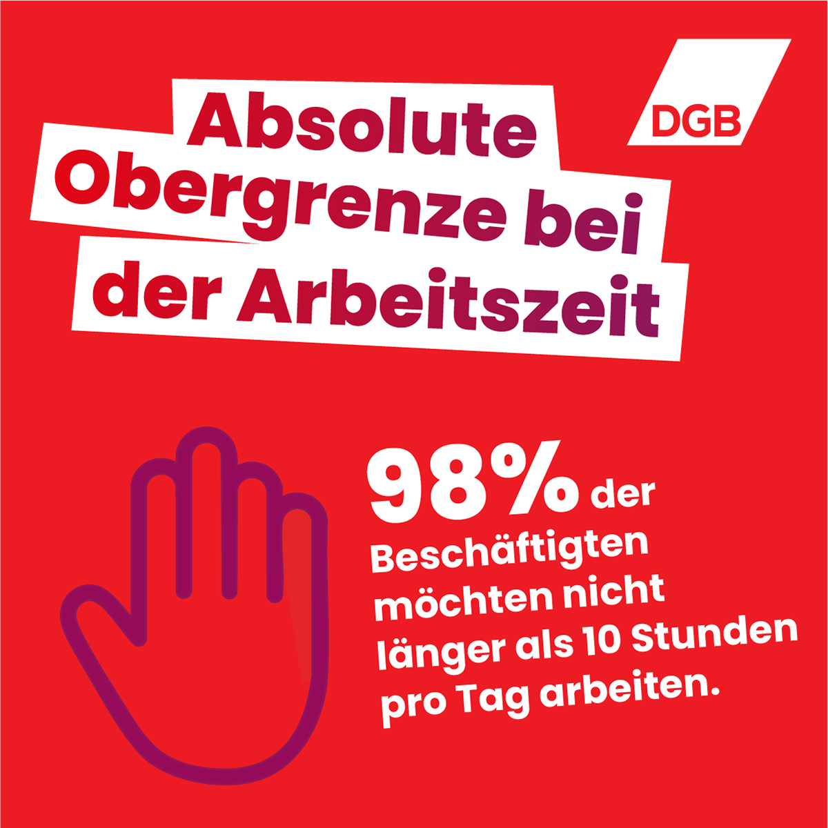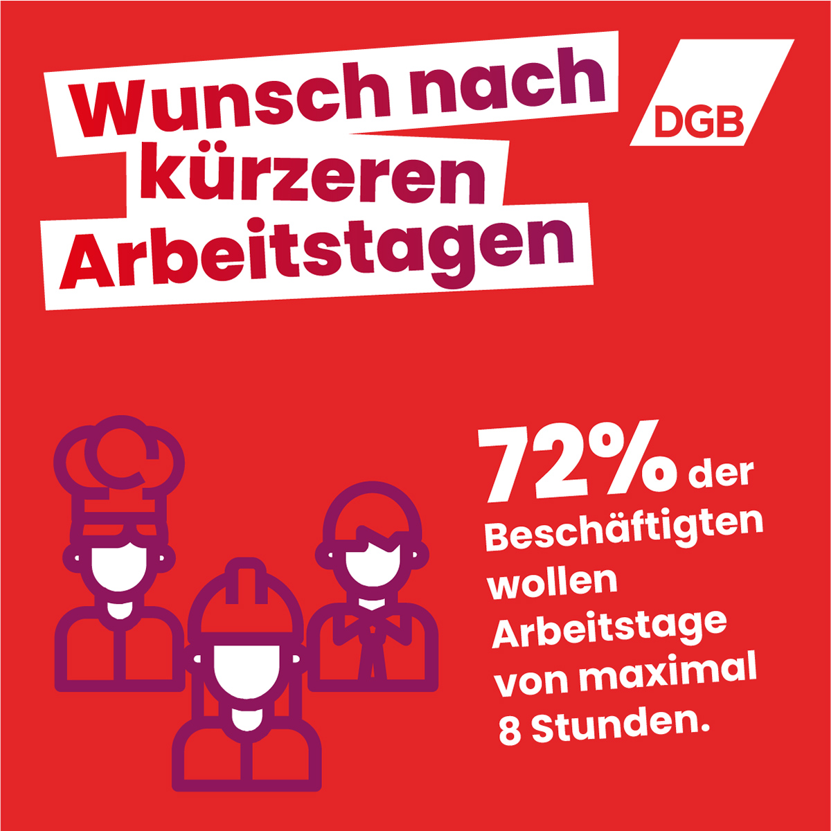 Seit 1918 gibt es in Deutschland den 8-Stunden-Tag. Er sorgt dafür, dass Menschen Zeit für ihre Familie, ihre Gesundheit und ihr Leben haben. Er ist auch ein Baustein unserer Demokratie – denn wer ständig arbeitet, hat keine Zeit für Politik und Gesellschaft. Diese Errungenschaft dürfen wir nicht aufgeben! Der 8-Stunden-Tag schützt alle Beschäftigten, vom Bauarbeiter bis zur Bürokraft, von der Pflegekraft bis zur Ingenieurin.