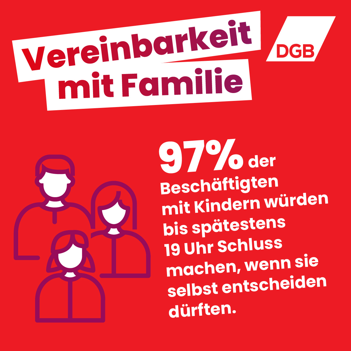 Die meisten Menschen wollen nicht länger arbeiten. 72 Prozent aller Beschäftigten würden bei freier Wahl maximal 8 Stunden pro Tag arbeiten. 95 Prozent wollen spätestens um 18 Uhr Feierabend haben. Besonders Eltern brauchen planbare Arbeitszeiten. Von denen, die heute schon oft nach 19 Uhr arbeiten müssen, wünschen sich 97 Prozent, früher Schluss zu haben. Zu diesen Ergebnissen kommt die repräsentative Umfrage Index Gute Arbeit. Diese Zahlen sprechen eine klare Sprache: Menschen wollen Zeit für ihre Familie, für Freunde, für Hobbys und für sich selbst. Sie wollen nicht ihr ganzes Leben der Arbeit opfern.